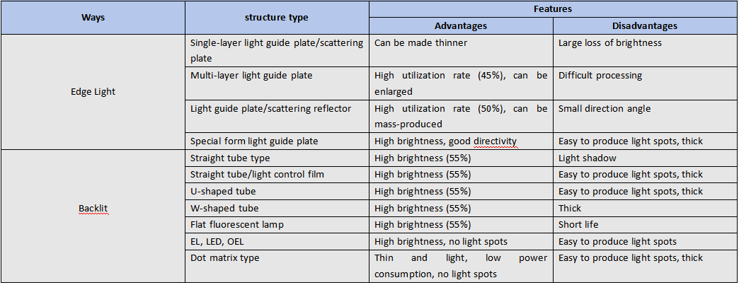 The structural feature of edge-lit backlight is that a linear or point-shaped light source is set on the back side of the liquid crystal display device, and then through a special light guide plate and a light homogenizer, it forms a uniform background light that is the same size as the liquid crystal display window and close to the liquid crystal display surface. Edge-lit backlights can generally be made very thin, and the backlight brightness can be made uniform. At the same time, because the light is placed on the side, the effect of the heat from the bulb on the liquid crystal display can be reduced. However, its light source utilization rate is lower than that of backlit backlights, only 40%~50%.