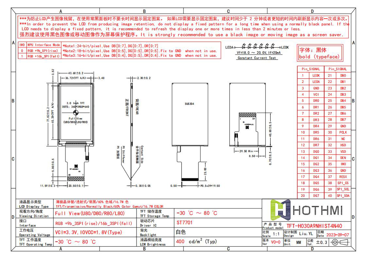 3.0 inch TFT LCD display | RGB 360x640 TFT Panel | ST7701