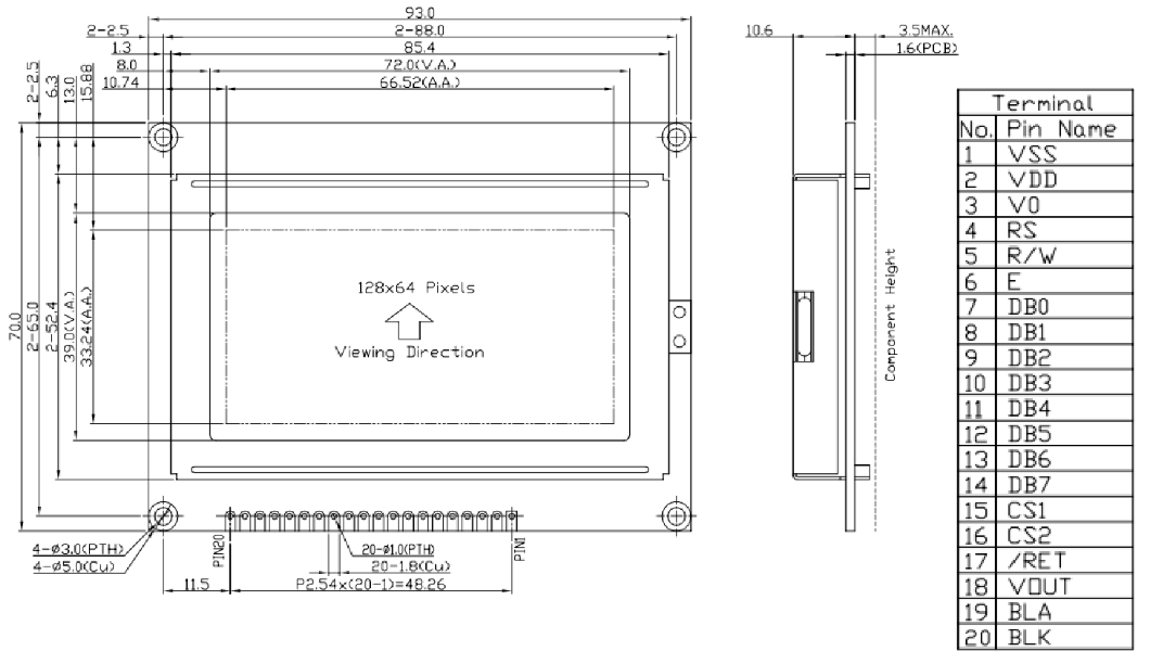 HTM12864B-25W-A5P is blue background, 128x64 monochrome white pixels, KS0107+KS0108 or compatible controller is very common and well documented, it is MCU interface, STN-blue LCD negative, wide operating temperature range, contrast ratio High, RoHS compliant and compact in size. The default is pin header connection.It can be easily controlled by MCUs such as 8051, PIC, AVR, ARDUINO, ARM and Raspberry Pi.